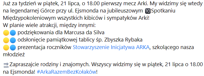 "Arkowcy! Widzimy się za tydzień w piątek o 18.00 na legendarnej Górce przy Ejsmonda na tradycyjnym, jubileuszowym Spotkaniu Międzypokoleniowym! Zapraszajcie rodziny i znajomych!" - zapraszają na Górkę przy ul. Ejsmonda.