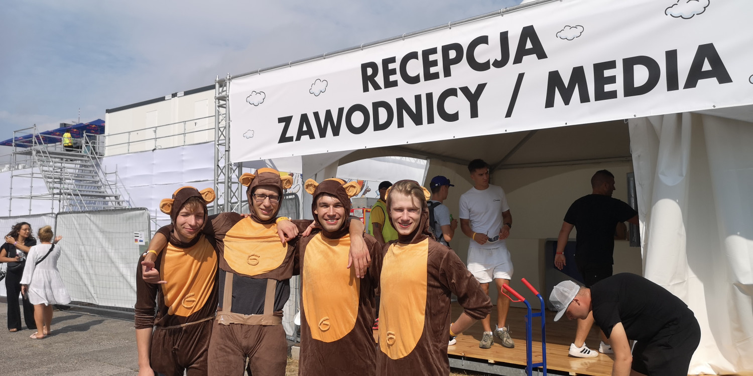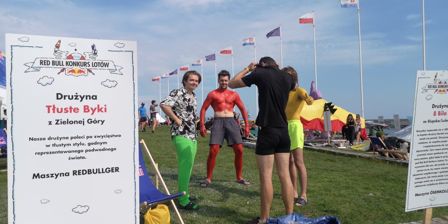 - Jesteśmy z Warszawy i Wrocławia, niektórzy z Mazur i jesteśmy debiutantami! Trochę nam stroje nie wyszły, ale i tak jest moc! Nasza lotnia trzyma się na taśmie to i my wytrzymamy – żartowali uczestnicy jednej z grup, jeszcze przed krótkim, za to spektakularnym lotem. – Jesteśmy studentami budownictwa, więc konstrukcja jest dla nas najważniejsza. A latamy na bananie. Najpierw ona potem dopiero performance – deklarowali Łukasz, Daniel, Kuba i Karol.