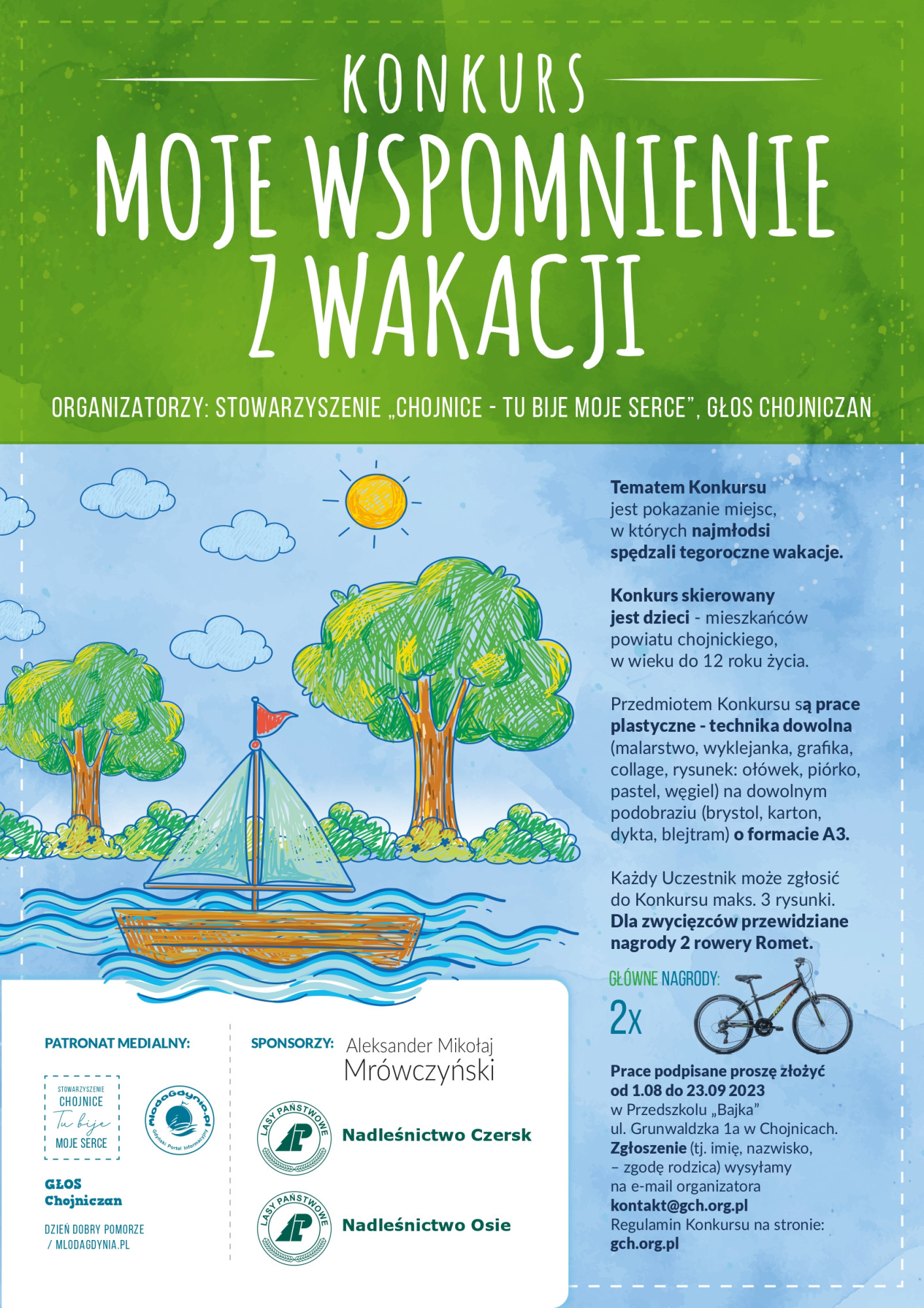 - Gorąco zachęcam do udziału w naszym kolejnym konkursie. Po sukcesie konkursu na zdjęcie ilustrujące temat "Chojnice - tu bije moje serce", którego finał zorganizowaliśmy w czasie festynu z okazji Dnia Dziecka, doszliśmy do wniosku, że pomysł spodobał się i warto pójść dalej. Stąd pomysł na wspomnienia z wakacji. Dzieci będą mogły przedstawić swoje spojrzenia na przeżycia i zdarzenia, w których uczestniczyły podczas wakacyjnych wypraw. Oczywiście można również pokazać wakacje "na miejscu". W Chojnicach mamy wiele atrakcyjnych miejsc, w których można wakacyjnie wypoczywać. Już mamy wiele pytań i nawet zgłoszeń. Dlatego uważam, że i ten konkurs przypadnie do gustu mieszkańcom naszego miasta - podkreśla Michał Gruchała ze Stowarzyszenia "Chojnice - tu bije moje serce".