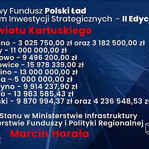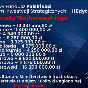 - Nieustannie dążymy do wyrównania szans rozwojowych poszczególnych regionów, które do tej pory nie szły do przodu w tym samym tempie i właśnie tam kierujemy zwiększone wsparcie finansowe. Dzięki temu programowi możemy pójść́ znacznie dalej i osiągnąć́ to, co od dawna było marzeniem milionów Polaków - wyższy poziom życia i bezpieczną przyszłość́ polskich rodzin – podkreśla minister Marcin Horała, który przedstawił kwotowo dotacje przyznane dla pomorskich gmin, miast i powiatów.