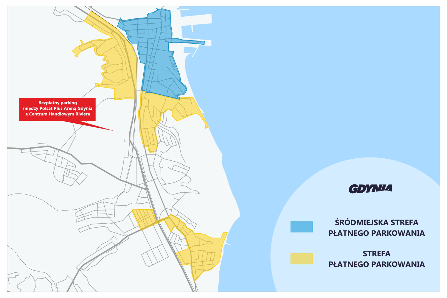 Mieszkańcom i turystom przypominamy, że do dyspozycji mieszkańców i turystów jest bezpłatny parking mieszczący się pomiędzy Polsat Plus Areną Gdynia a Centrum Handlowym Riviera.