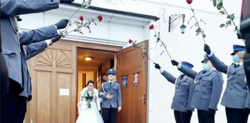Podczas wyjścia z kościoła, koleżanki i koledzy w mundurach przygotowali młodej parze szpaler z róż.