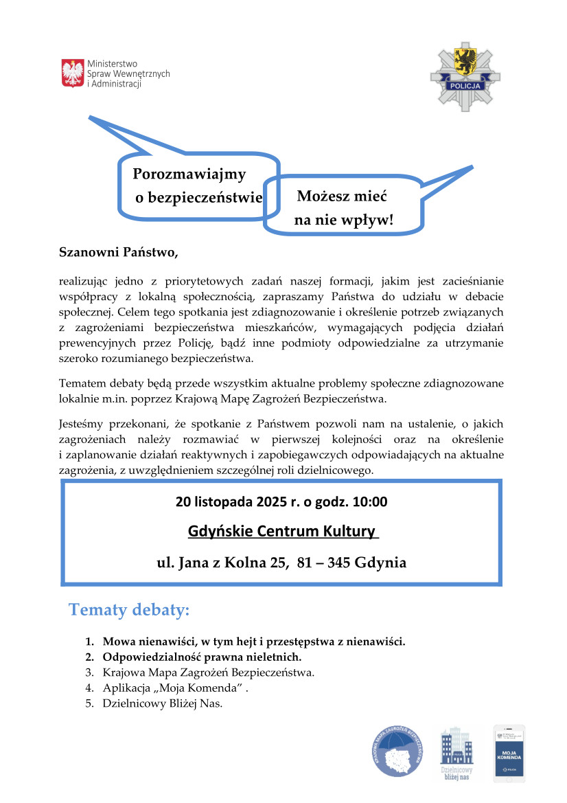 Policja zaprasza mieszkańców Gdyni na otwartą debatę społeczną poświęconą bezpieczeństwu. Spotkanie ma możliwość umożliwić mieszkańcom realny wpływ na działania prewencyjne oraz określenie najważniejszych lokalnych zagrożeń.