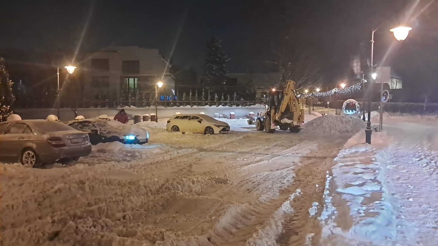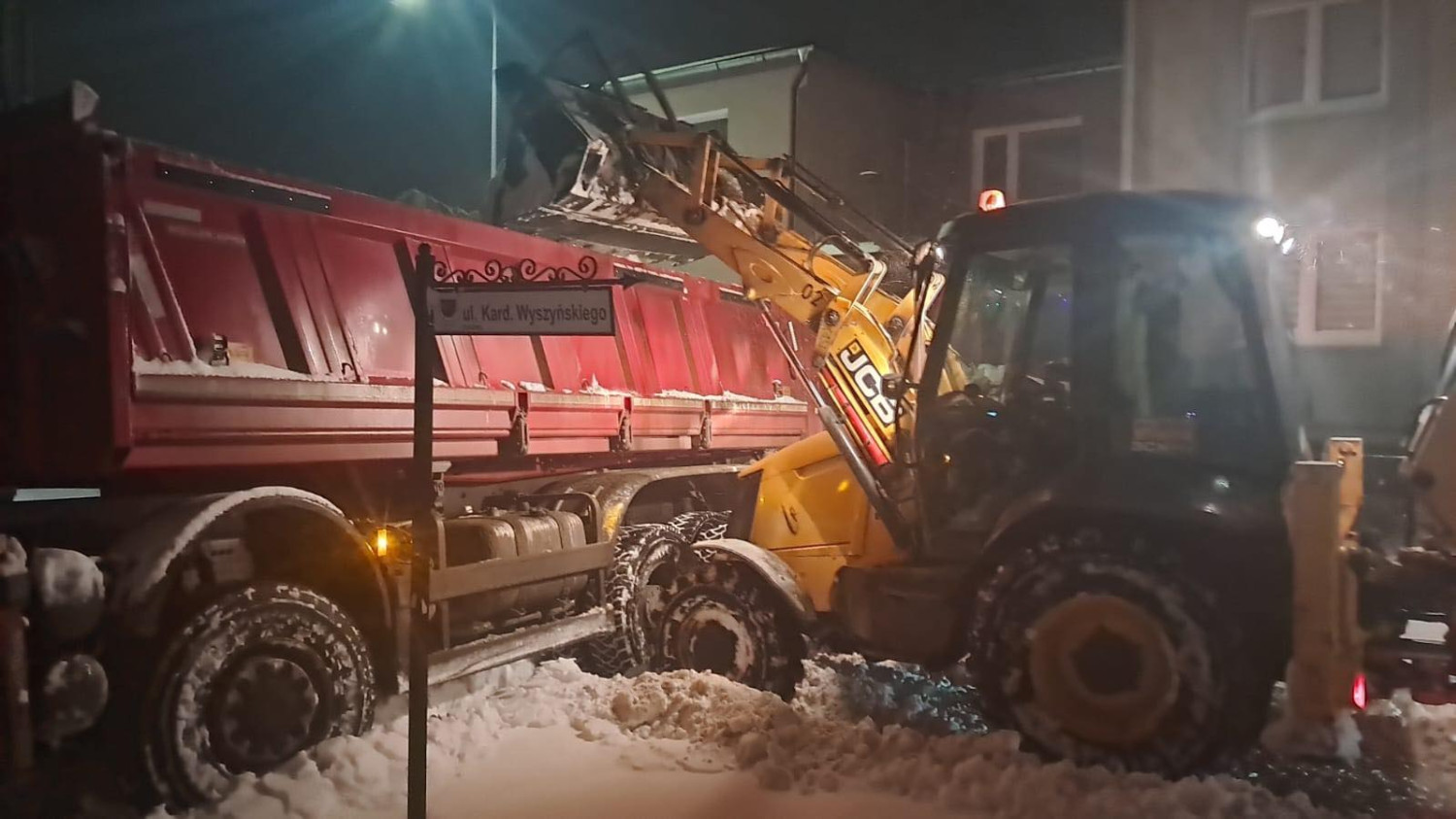 Mimo godzin nocnych odśnieżanie prowadzone jest nadal. Zgarniany śnieg jest koparkami ładowany na wywrotki i wywożony z rejonu ulic. Służby gminne chcą zrobić wszystko, by rano główne drogi w gminie były przejezdne.