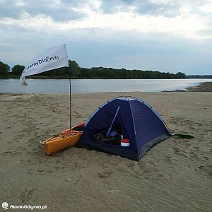 Majestatycznie przepłynął przez Toruń prezentując flagę #PłyniemyDlaEmila. Na miejsce pierwszego noclegu wybrał łachę pośrodku Wisły na wysokości Bydgoskiego Przedmieścia w Toruniu. Tam w spokoju rozbił namiot i spędził noc bez obaw, że ktoś sprawi mu jakąś niespodziankę. Trudno dostać się na łatę bez łodzi... W nocy nad grodem Kopernika przeszła długa ulewa.