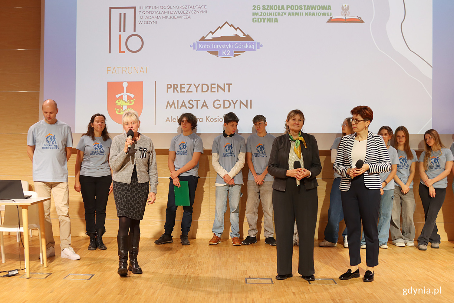 Błękitne Horyzonty 2025 w PPNT w Gdyni. Na zdjęciu od lewej naczelniczka Wydziału Edukacji UMG Iwona Tanewska, dyrektorka II LO Elżbieta Zaręba oraz dyrektorka SP 26 Anna Pączek, w tle Marcin Jank z II II LO w Gdyni, Alicja Jank z SP nr 26, uczniowie i uczennice z II LO i SP 26 w Gdyni (fot. Katarzyna Balcerzak)