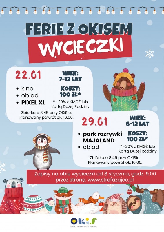 Koszt udziału wynosi 400 zł za tydzień, a po zniżce 320 zł. (20% zniżki otrzymują posiadacze Karty Mieszkańca Gminy Żukowo, Karty Dużej Rodziny lub Eko-Ambasadora). Warto pamiętać, że czwartkowe wycieczki realizowane w trakcie ferii wymagają osobnych zapisów.Zapisy na ferie z OKiSem prowadzone będą online za pośrednictwem Strefy Zajęć.