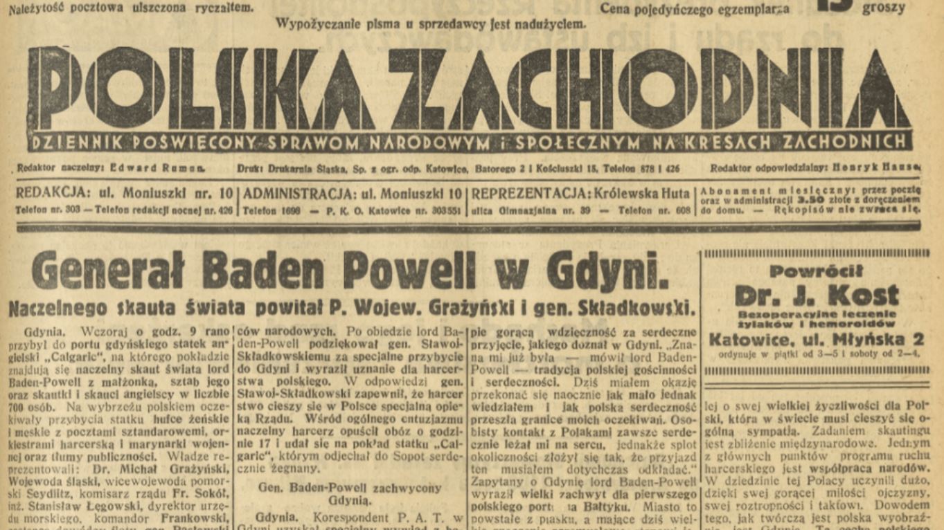 "Zapytany o Gdynię lord Baden-Powell wyraził wielki zachwyt dla pierwszego polskiego portu na Bałtyku. Miasto to powstałe z piasku, a mające dziś wielkie znaczenie przemysłowe, stanowi jego zdaniem, symbol twórczej pracy polskiej. Lord Baden-Powell zapewnił dalej o swej wielkiej życzliwości dla Polski, która w świecie musi cieszyć się ogólną sympatią.