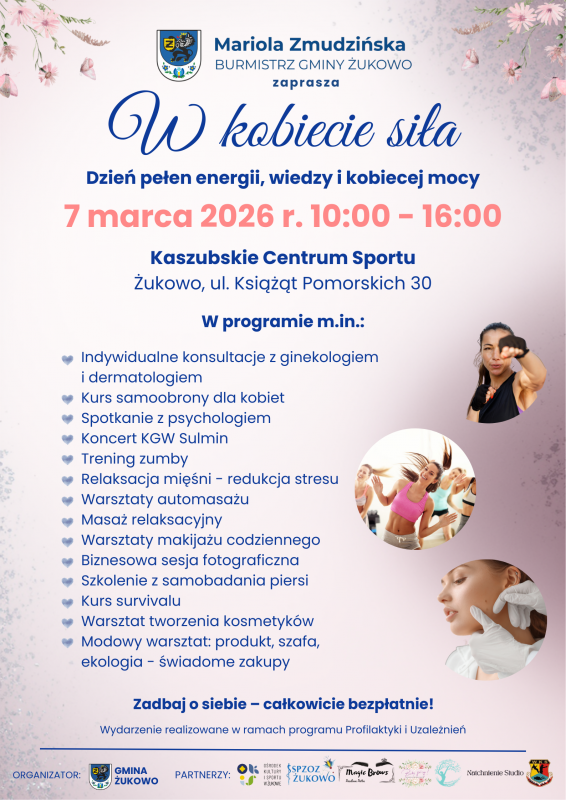 W sobotę, 7 marca, Kaszubskie Centrum Sportu w Żukowie stanie się przestrzenią dedykowaną kobietom – ich zdrowiu, rozwojowi i dobremu samopoczuciu. Gmina Żukowo zaprasza na wyjątkowe wydarzenie pod hasłem „W kobiecie siła”, które łączy profilaktykę zdrowotną, warsztaty, aktywność fizyczną oraz czas na relaks i inspirację.