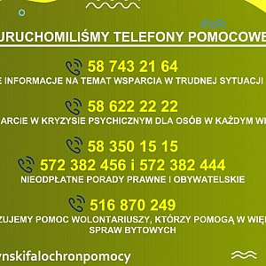 Gdynia uruchomiła specjalny telefon: 58 743-21-64. Każdy mieszkaniec może tam zasięgnąć informacji na temat wsparcia w trudnej sytuacji spowodowanej pandemią koronawirusa. Działa od poniedziałku do piątku w godz. 08.00-20.00. Dyżurują pod nim specjaliści, którzy odpowiadają na pytania dotyczące: