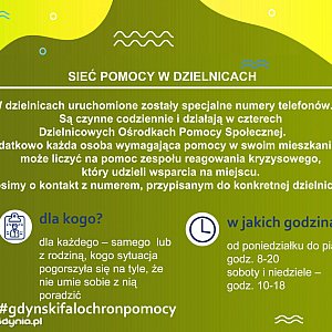 Z myślą o osobach potrzebujących wsparcia w sytuacjach zagrożenia zdrowia i życia w Dzielnicowych Ośrodkach Pomocy Społecznej (DOPS) uruchomiono dyżury telefoniczne oraz mobilne zespoły reagowania kryzysowego. Służą pomocą przez siedem dni w tygodniu - od poniedziałku do piątku w godz. 8.00 - 20.00, a w weekendy między godz. 10.00 a 18.00. W razie potrzeby należy się tam zgłaszać telefonicznie - odpowiednio do miejsca zamieszkania: