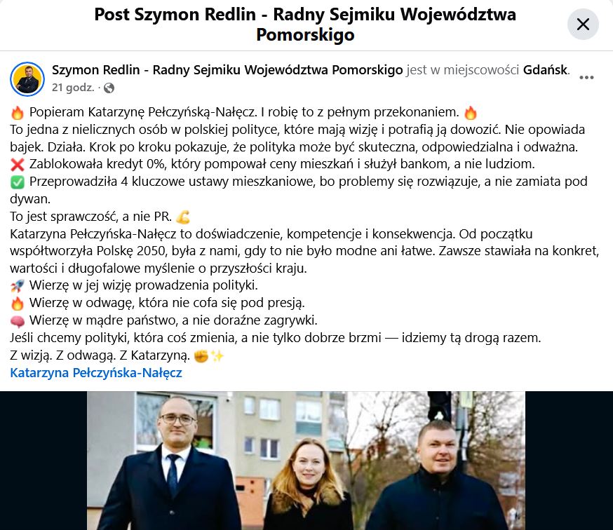 Zdjęcie zamieszczone przez ministrę znalazło się również w relacji zamieszczonej na FB Polska 2050 Pomorskie.