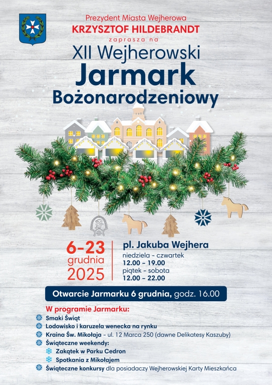 Zapraszamy na wyjątkowy, świąteczny czas pełen tradycji, aromatów i zimowej atmosfery! Już 6 grudnia rozpoczyna się w Wejherowie XII Jarmark Bożonarodzeniowy, który jak co roku wypełni miasto blaskiem lampek, muzyką i radosnymi spotkaniami. Jarmark Bożonarodzeniowy potrwa do 23 grudnia. Czynny jest od niedzieli do czwartku w godz. 12:00 do 19:00, a w piątki i soboty do godz. 22:00.