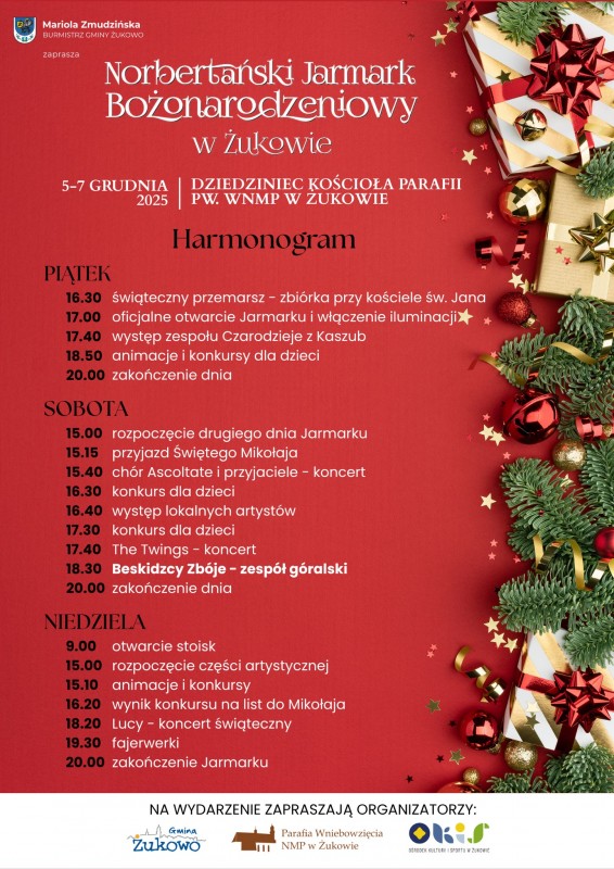 - Gorąco zapraszam wszystkich mieszkańców naszej gminy na tegoroczny Norbertański Jarmark Bożonarodzeniowy w Żukowie. Zapraszam również mieszkańców z innych gmin, którzy zachcą odwiedzić Żukowo i skorzystać z oferty stoisk specjalnie przygotowanych dla Państwa w tym roku. Tradycyjnie zaprezentują się nasi partnerzy z gminy Świdnica oraz Francji i Niemiec. Nie zabraknie koncertów i atrakcji dla najmłodszych. Pojawi się Mikołaj, będą świetlne iluminacje. Szczególnie zapraszam na stoiska Kół Gospodyń Wiejskich z naszej gminy. Spotykamy się w piątek, sobotę i niedzielę - zaprasza Mariola Zmudzińska, Burmistrz Gminy Żukowo.