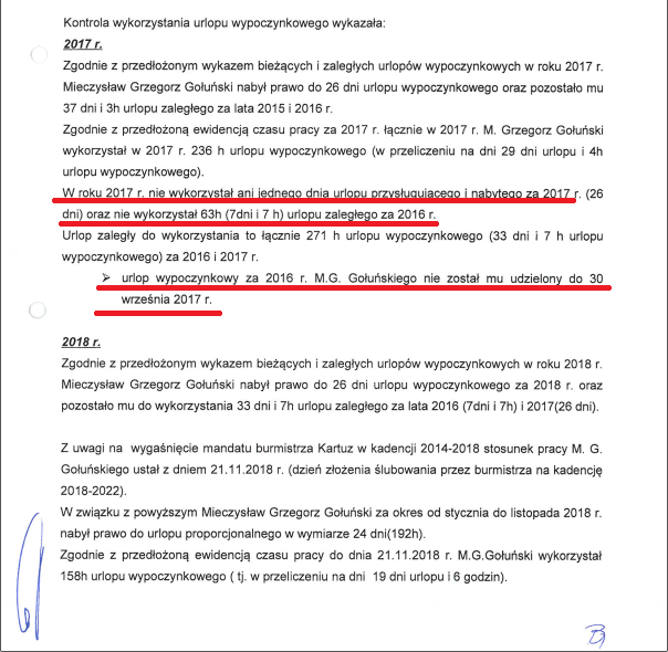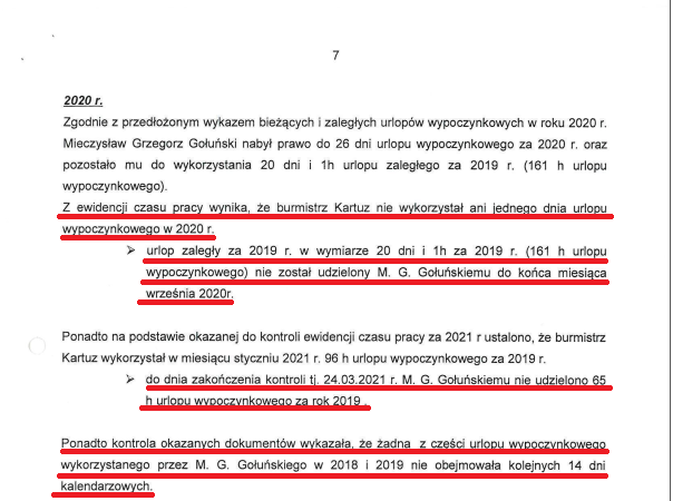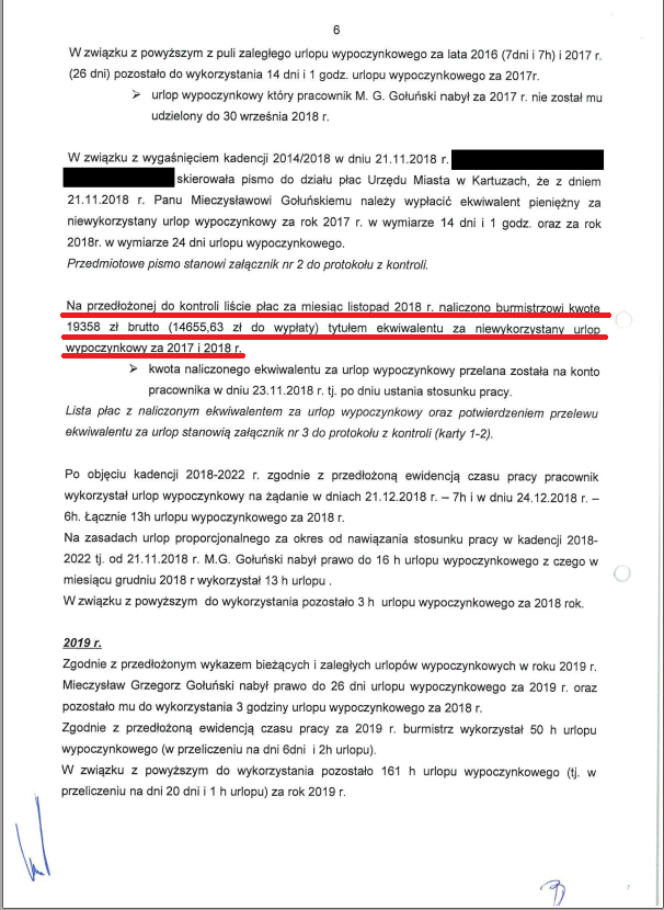 Zgodnie z przepisami urlop zaległy należy wykorzystać do 30 września roku następującego po roku, w którym pracownik nabył prawo do tego urlopu. Niewykorzystane urlopy w trakcie kadencji burmistrza przekształcają się w prawo do ekwiwalentu pieniężnego po rozwiązaniu stosunku pracy, co następuje z chwilą wygaśnięcia mandatu.W protokole kontroli możemy przeczytać, że w żadnym z kontrolowanych lat (od 2016 r.) Burmistrz Gołuński nie wykorzystał urlopu wypoczynkowego zgodnie z przepisami. Dodatkowo kończąc kadencję w listopadzie 2018 roku otrzymał sowity ekwiwalent w wysokości prawie 20 000 zł brutto!