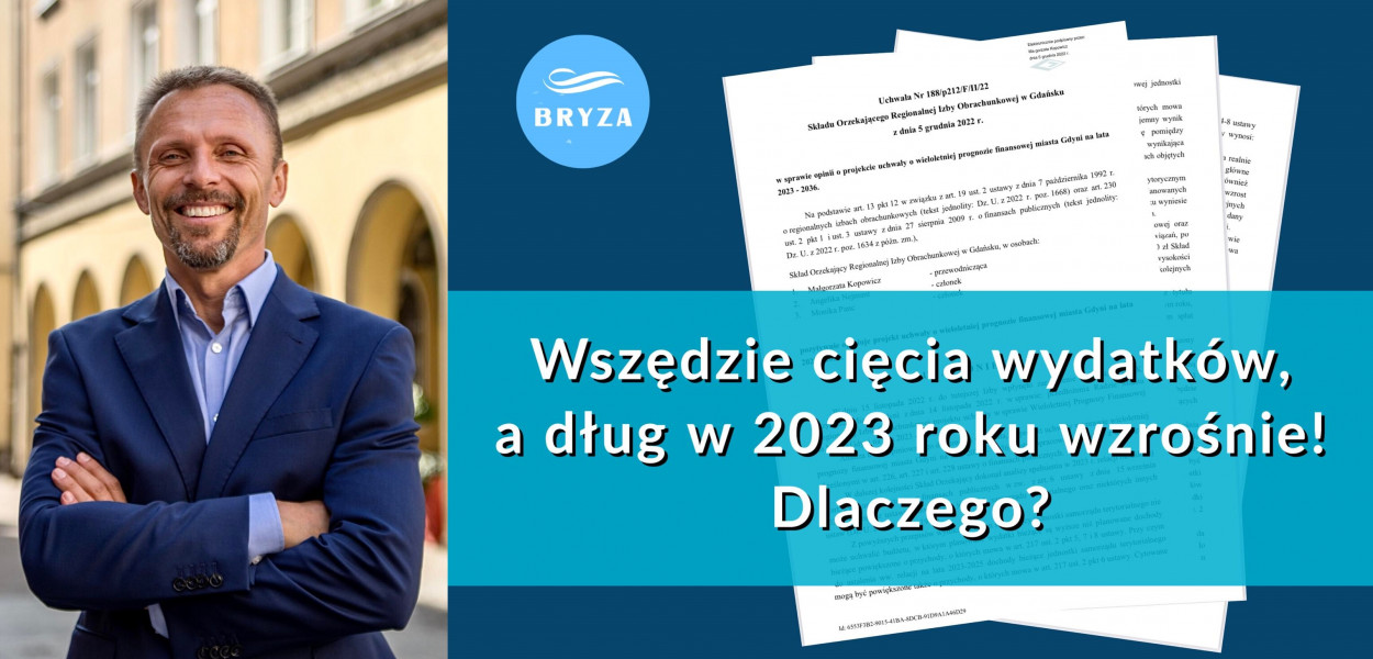 Pomimo ogromnej redukcji ilości połączeń komunikacji miejskiej, pomimo braku dużych inwestycji gminnych, (Gdynia nie wybudowała od lat żadnego mieszkania gminnego ogólnodostępnego), nie buduje się ani lodowiska, ani pływalni, ani żłobka, ani przedszkola, ani szkoły, ani wiaduktu, ani tunelu, ani żadnej nowej drogi, pomimo ogromnych cięć w wydatkach na edukację, pomimo obcięcia finansowania prawie wszystkich zajęć pozalekcyjnych, pomimo obniżenia wydatków na sport dzieci i młodzieży, dług Gdyni na koniec przyszłego roku nie zmniejszy się, a nawet nieco zwiększy w stosunku do długu za 2022 rok.
