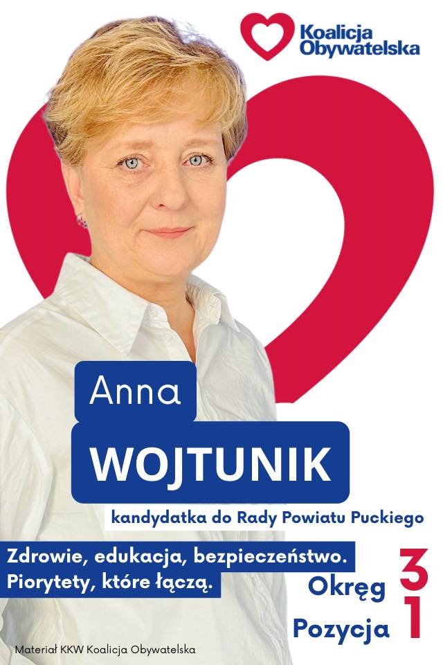 Prezentujemy dziś Annę Wojtunik, mieszkankę gminy Kosakowo, która kandyduje do Rady Powiatu Puckiego.Jest radną obecnej, kończącej się kadencji. Pełniła funkcję wiceprzewodniczącej Rady Powiatu.