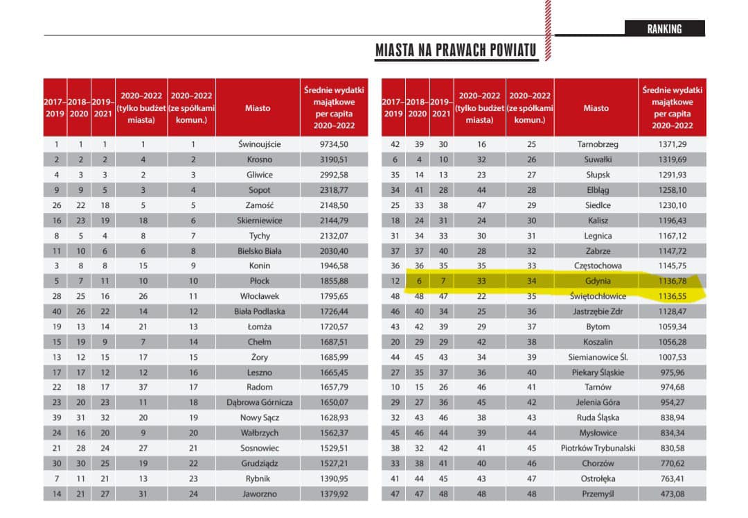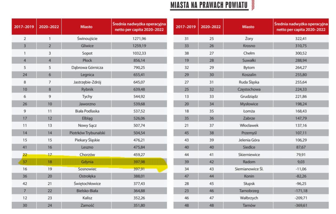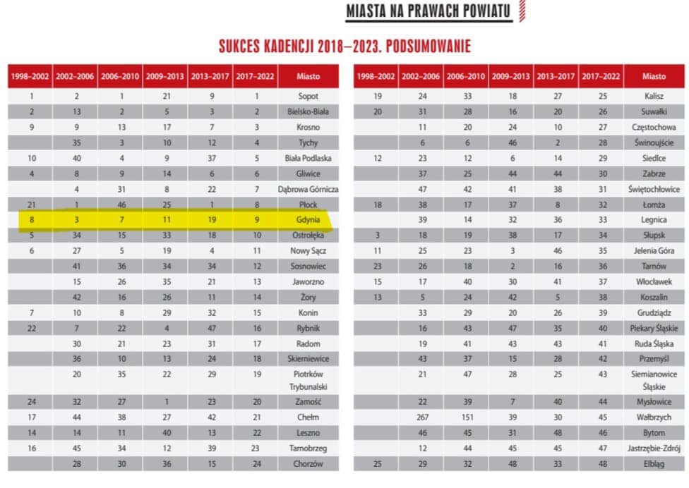 Ostatecznie łączna ocena Gdyni czyli sukces kadencji, to spadek z 8 na 9 miejsce.