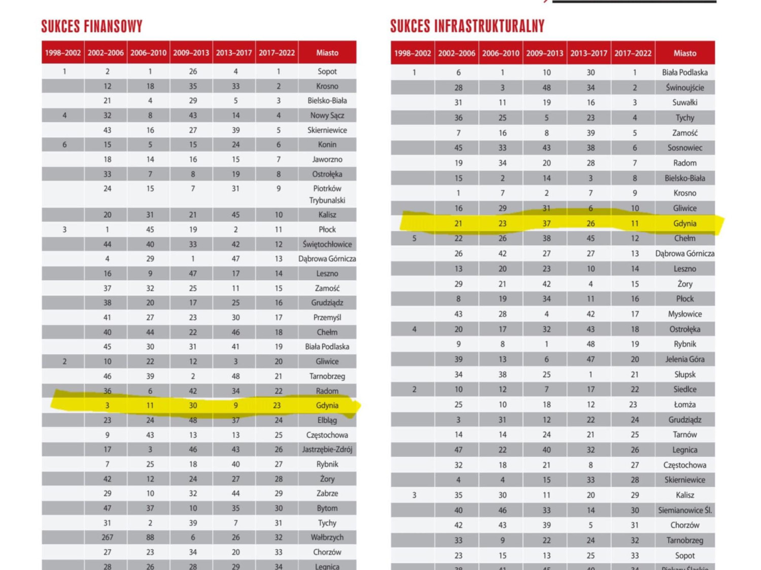 W kategorii sukces finansowy, Gdynia nie odniosła sukcesu gdyż spadła z 3 miejsca na 20.