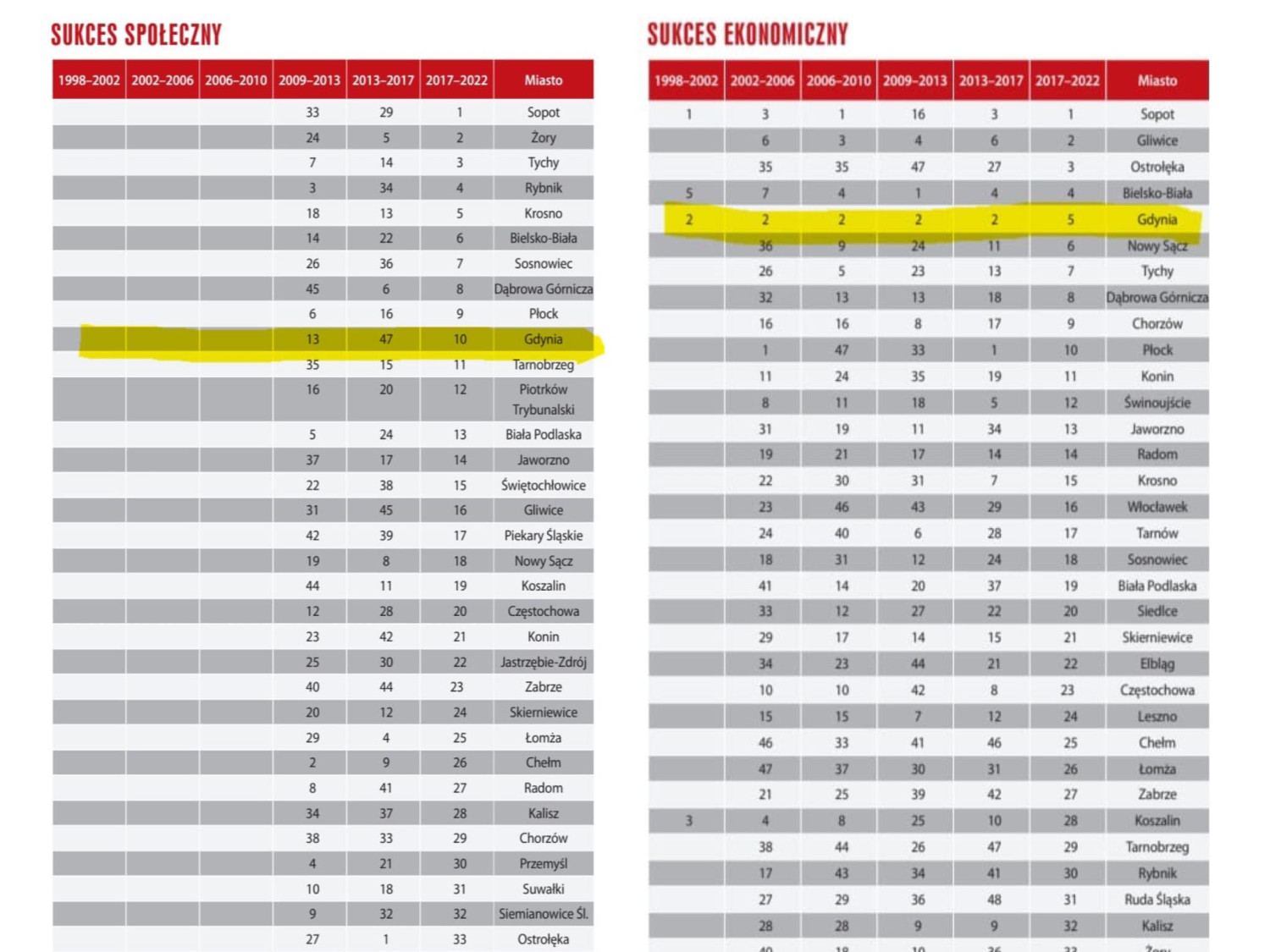 Podobnie w kategorii sukces ekonomiczny, Gdynia spadła z 2 miejsca na 5.