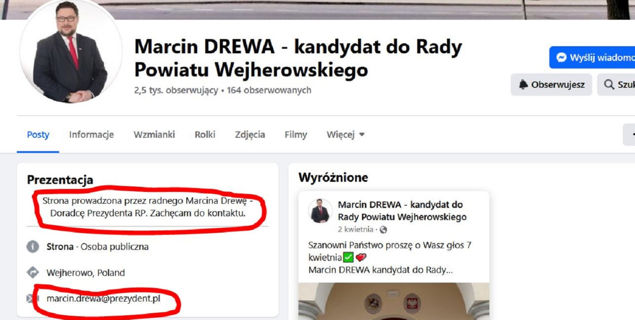 Jest również informacja o treści: „Strona prowadzona przez Marcina Drewę – Doradcę Prezydenta RP. Zachęcam do kontaktu.”