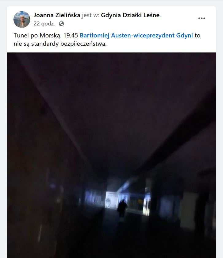 Radna Zielińska wstawiła na FB zdjęcie tunelu pod ul. Morską ogarniętego całkowitą ciemnością. Wywołała wiceprezydenta Bartłomieja Austena, który w komentarzu napisał: „Zajmę się tym. Dzięki za zgłoszenie.”