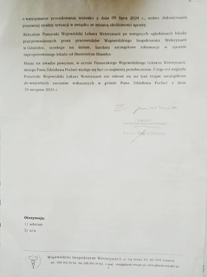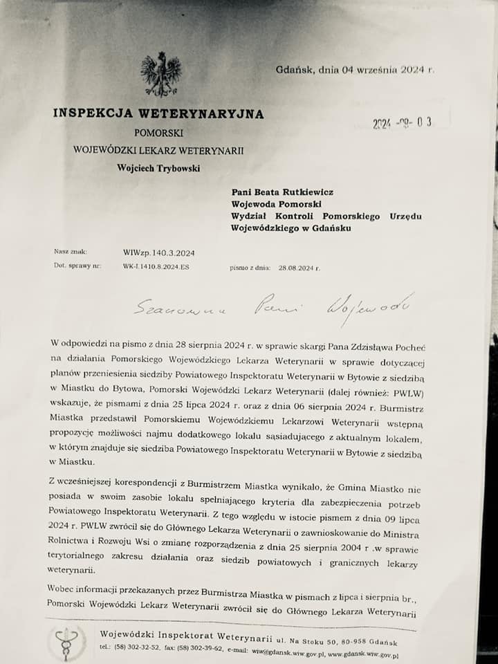 "Jak wynika z odpowiedzi Pomorskiego Wojewódzkiego Lekarza Weterynarii w Gdańsku na skargę pana Zdzisława Pocheć do pani Wojewody Pomorskiej - to w gestii burmistrza Miastka - Jerzego Wójtowicza stoi obowiązek przedstawienia szczegółowych informacji odnośnie ewentualnego nowego lokalu. Z wcześniejszej korespondencji burmistrza Wójtowicza wynikało, że gmina nie posiada lokalu spełniające kryteria dla zapewnienia nowych potrzeb Inspektoratu w Miastku i dlatego Lekarz Wojewódzki zgłosił do Głównego Lekarza Weterynarii o zmianę lokalizacji na Bytów.
