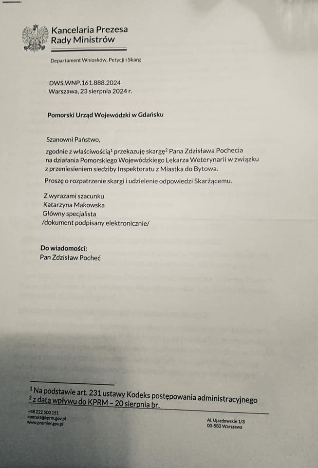 Za to redaktor Pocheć od wielu miesięcy kontaktuje się z Wojewodą Pomorską Beatą Rutkiewicz oraz Kancelarią Prezesa Rady Ministrów Donalda Tuska. Dziś są już tego efekty. Przenosiny Inspekcji Weterynaryjnej do Bytowa zostały wstrzymane!