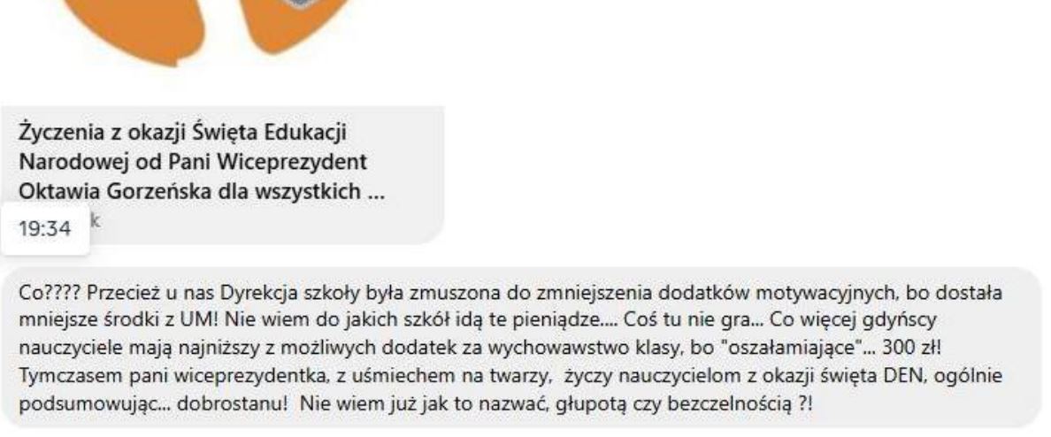 Sprawa wydaje się co najmniej wątpliwa. Skoro średnie dodatki wzrosły, a przynajmniej część nauczycieli dostaje mniej, to gdzie trafiają te pieniądze? Czy są one przydzielane szkołom według „widzimisię” władz? Całość wygląda dość dziwnie — szczególnie w kontekście tego, że stan nakładów na gdyńską edukację wygląda dobrze tylko na facebookowych postach pani Gorzeńskiej.