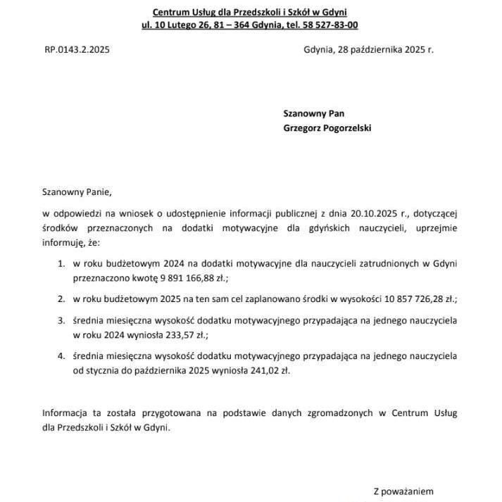 "Niedawno zapytałem Urząd Miasta o premie motywacyjne dla nauczycieli. W odpowiedzi otrzymałem informację, że średni dodatek motywacyjny dla nauczyciela w gdyńskiej szkole w porównaniu z rokiem ubiegłym wzrósł z kwoty 233,57 zł do 241,02 zł miesięcznie." - mówi Grzegorz Pogorzelski.