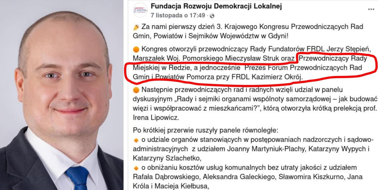 Zdziwienie ogarnęło Marcina Ruszczyka z redy, kiedy przeczytał w programie odbywającego się w ubiegłym tygodniu 3. Krajowego Kongresu Przewodniczących Rad Gmin, Powiatów i Sejmików Województw w Gdyni, że jednym z występujących jest Kazimierz Okrój - Przewodniczący Rady Miejskiej w Redzie.