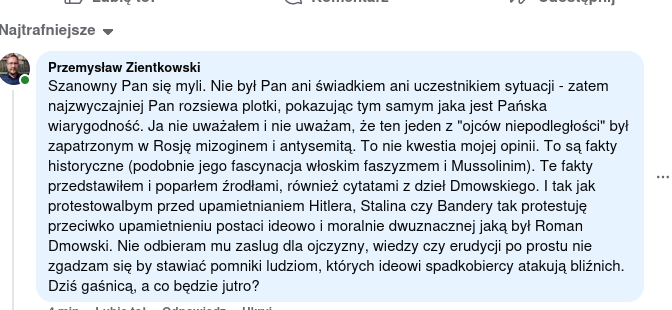 W swoim wpisie przyrównał on jednego z ojców niepodległości – Romana Dmowskiego – do Hitlera, Stalina i Bandery. We wspomnianym wpisie obrażał również moją osobę. Po jakimś czasie usunął tę wpis.