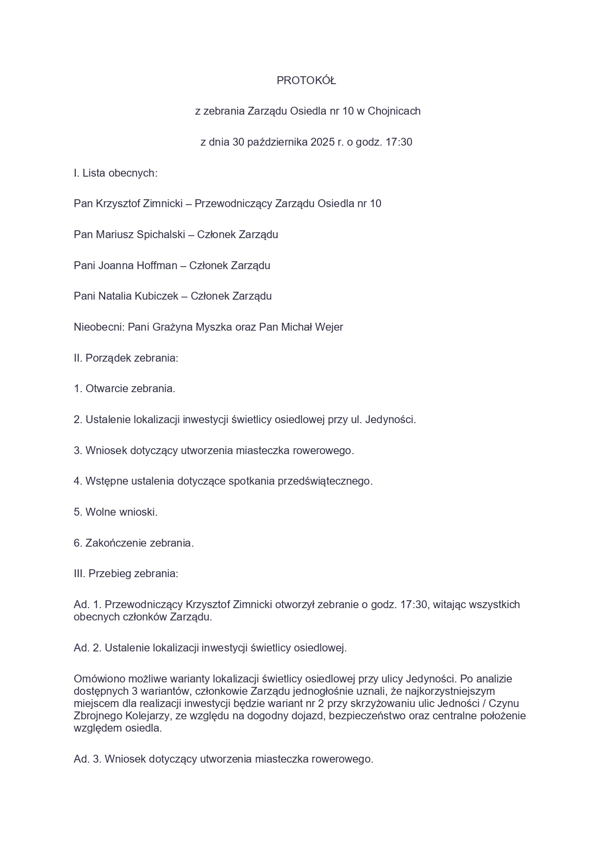 30 października 2025 r. o godz. 17:30 odbyło się zebranie Zarządu Osiedla Kolejarz-Prochowa w Chojnicach. Na zebraniu były 4 osoby z kurczącego się po wyborze na przewodniczącego zarządu Krzysztofa Zimnickiego zarządu. Wybrano lokalizację przy ulicy Jedności jako miejsce świetlicy osiedlowej i zgłoszono chęć utworzenia miasteczka rowerowego przy ulicy Jedności.