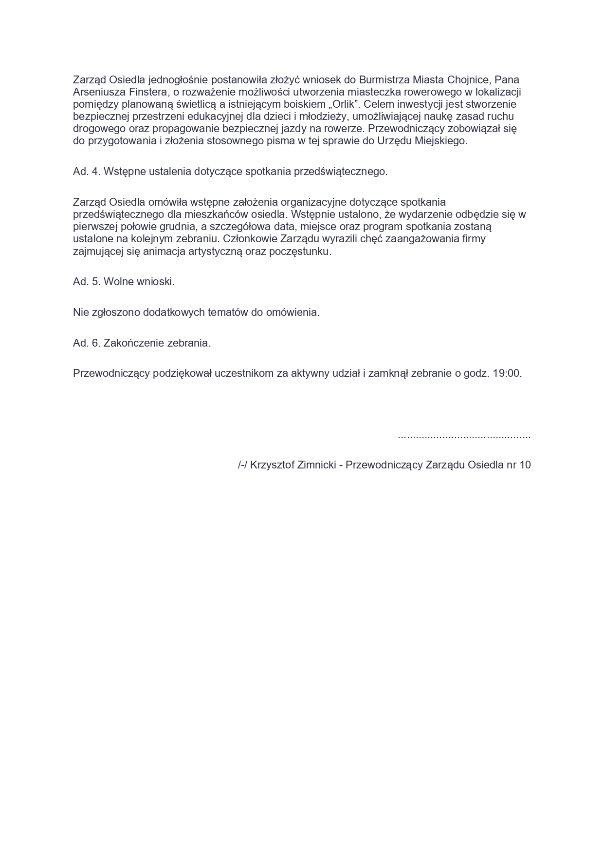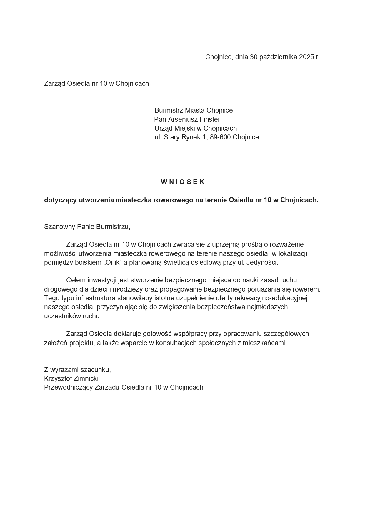 Zarząd Osiedla jednogłośnie postanowił złożyć wniosek do burmistrza miasta Chojnice, Arseniusza Finstera, o rozważenie możliwości utworzenia miasteczka rowerowego w lokalizacji pomiędzy planowaną świetlicą a istniejącym boiskiem „Orlik”.