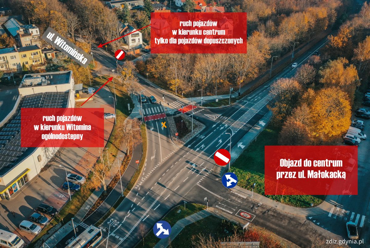 Na ul. Witomińskiej, pomiędzy ul. Bursztynową a Cmentarzem Witomińskim w kierunku do centrum, dopuszczony zostanie ruch wyłącznie pojazdów: rowerów, BUS, TAXI, GTOzN, Służb Ratunkowych, Nadzoru Ruchu ZKM, EV, H2, motocykli i motorowerów.