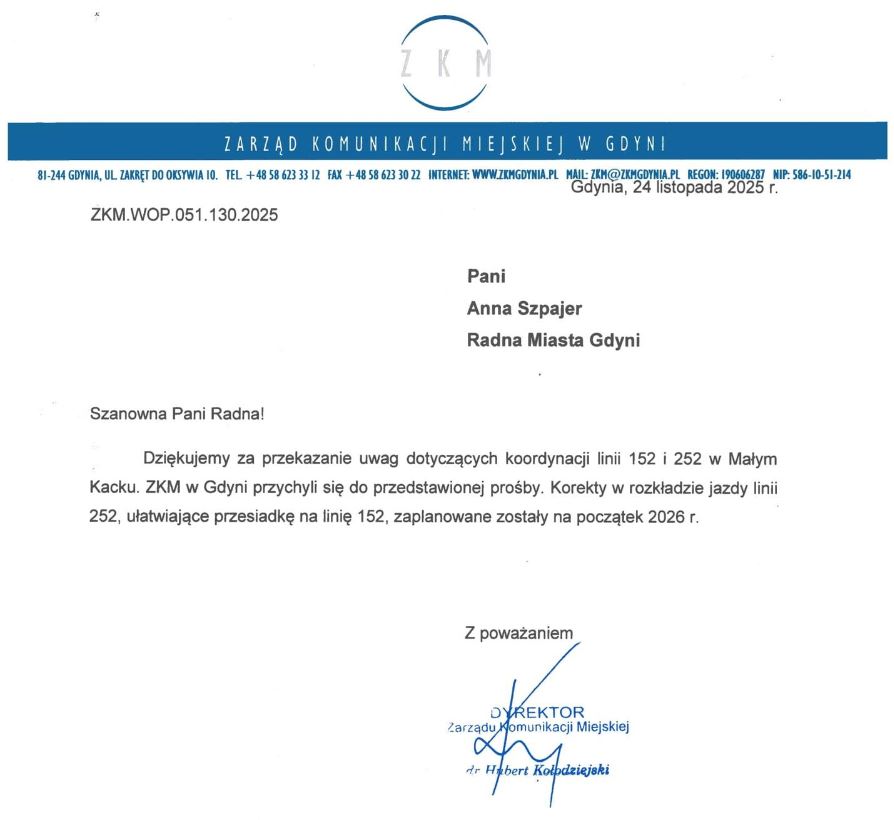 Anna Szpajer, radna Gdyni przedstawiła pismo otrzymane z ZKM Gdynia z udzieloną odpowiedzią w sprawie skorygowania rozkładu jazdy linii 152 i 252 na pętli Sandomierska w Małym Kacku.