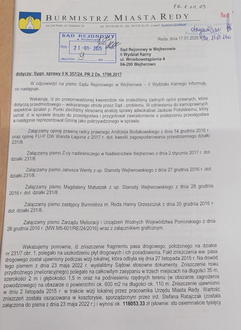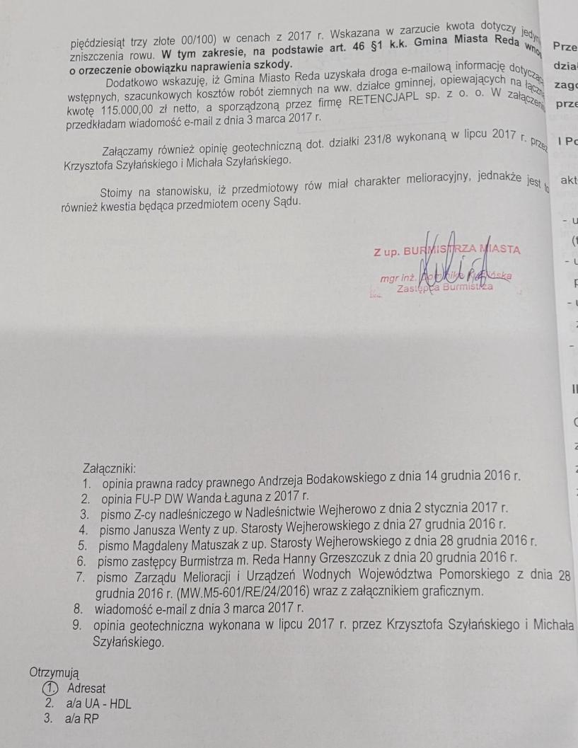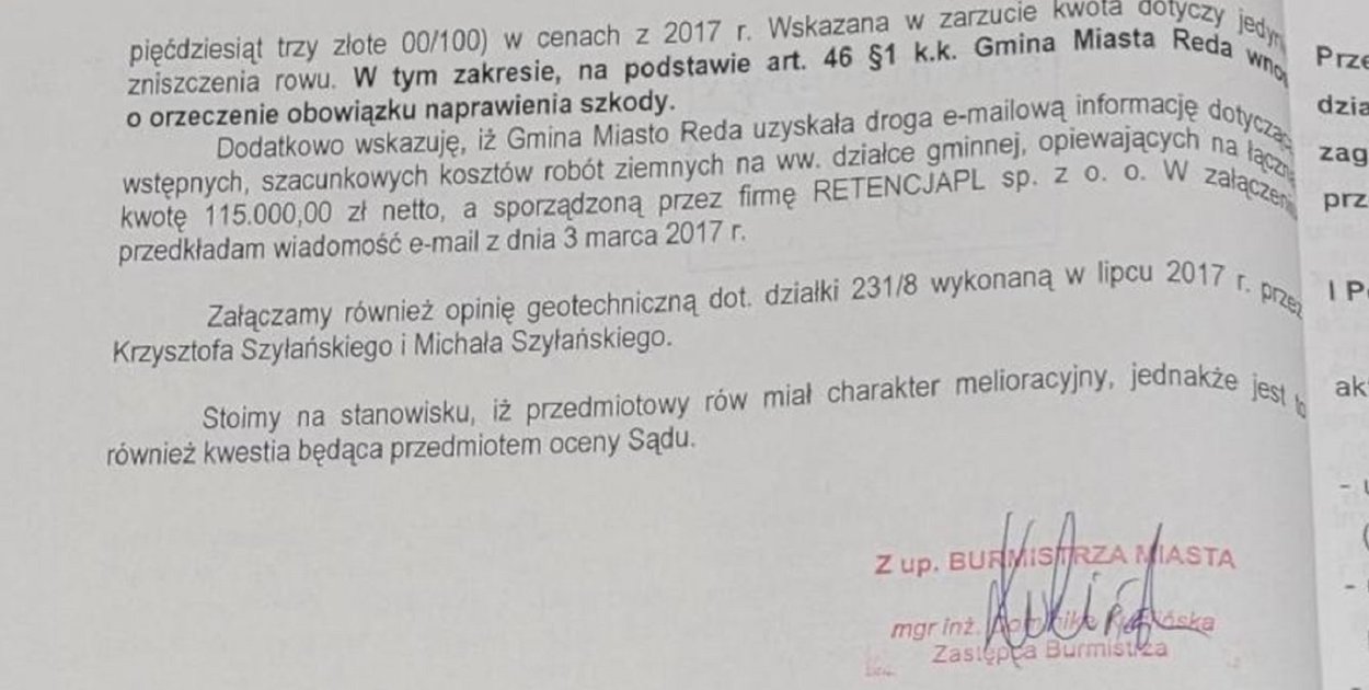 Kiedy Sąd wezwał Urząd Miasta w Redzie do uzupełnianie dokumentów, pismo podpisała właśnie Dominika Kudlińska, która wyszczególniła w nim załączniki.
