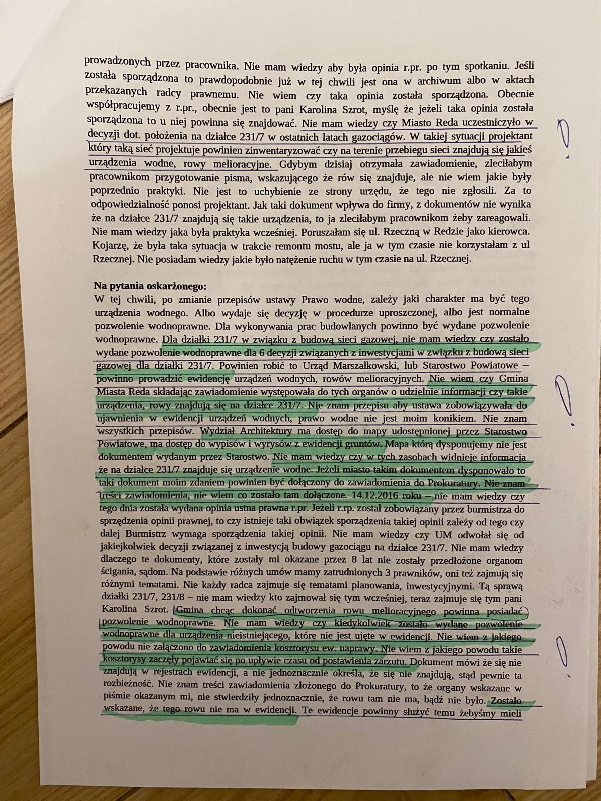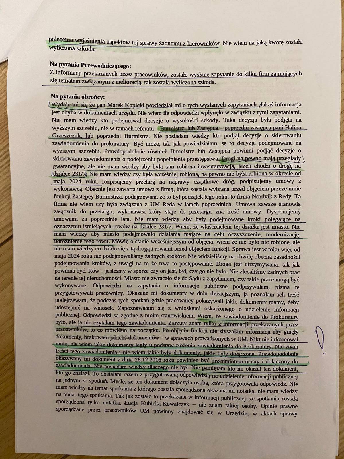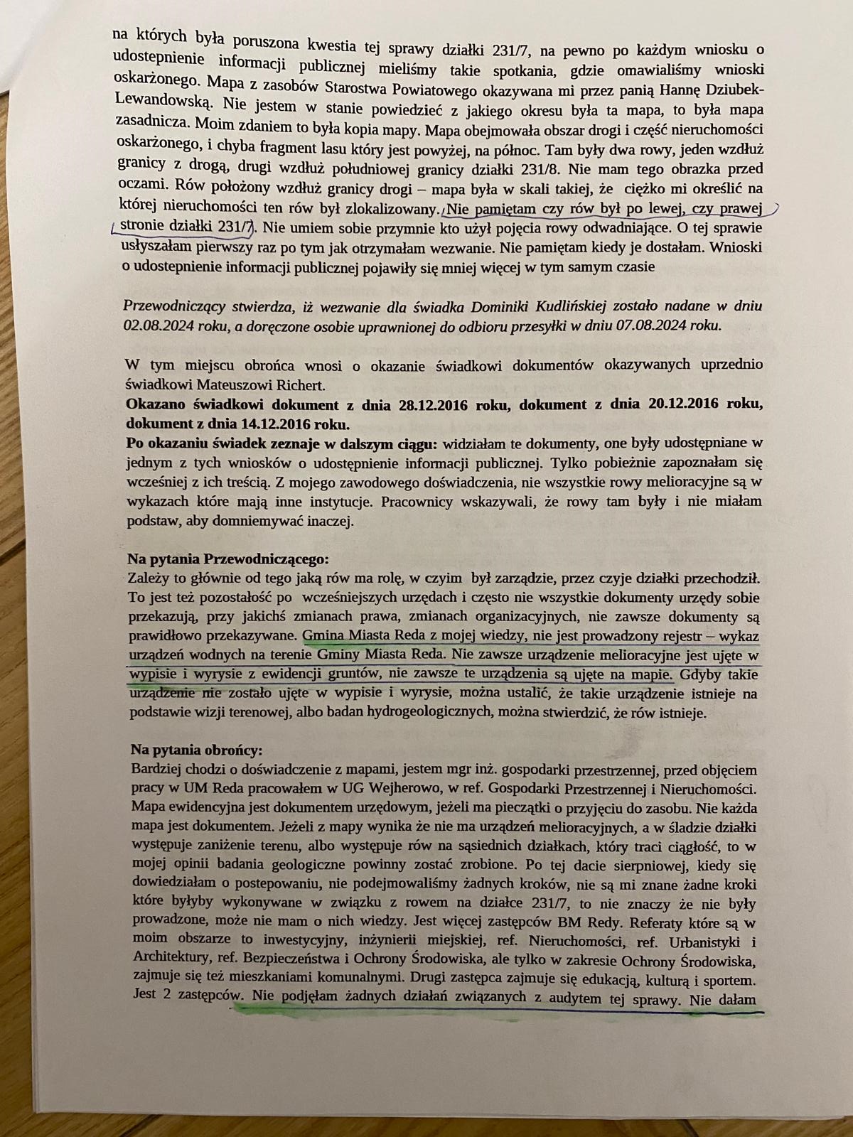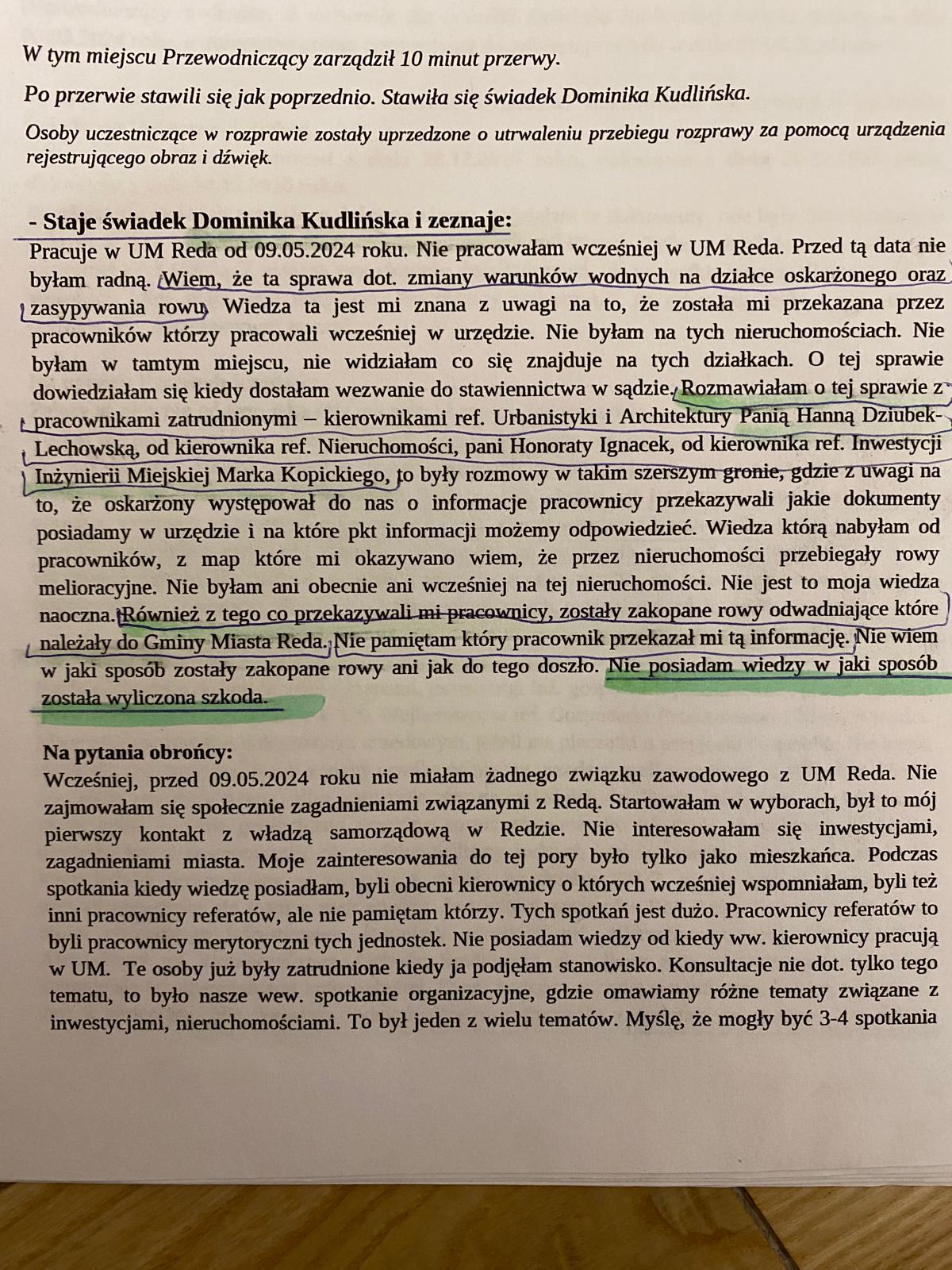 Na dodatek zeznała przed Sądem, że o sprawie rozmawiała z pracownikami Urzędu Miasta. Wspomniała również o tym, że „gdybym dzisiaj otrzymała zawiadomienie zleciłabym pracownikom przygotowanie pisma, że rów się znajduje”.