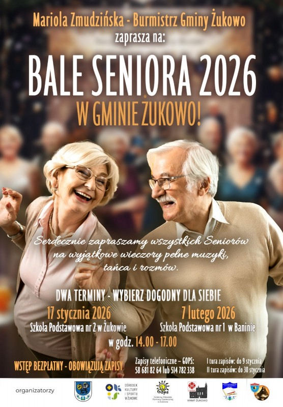 Bale organizują: Caritas Żukowo, GOPS, OKiS, Gmina Żukowo oraz Szkoły Podstawowe nr 2 w Żukowie i nr 1 w Baninie. To doskonała okazja do wspólnych spotkań, rozmów, tańca i dobrej zabawy, a także do wspólnego świętowania, rozmów, tańca i radości. Przekaż tę informację dalej, rodzicom i dziadkom, bo to od nich samych zależy, czy znajdą się na parkiecie.