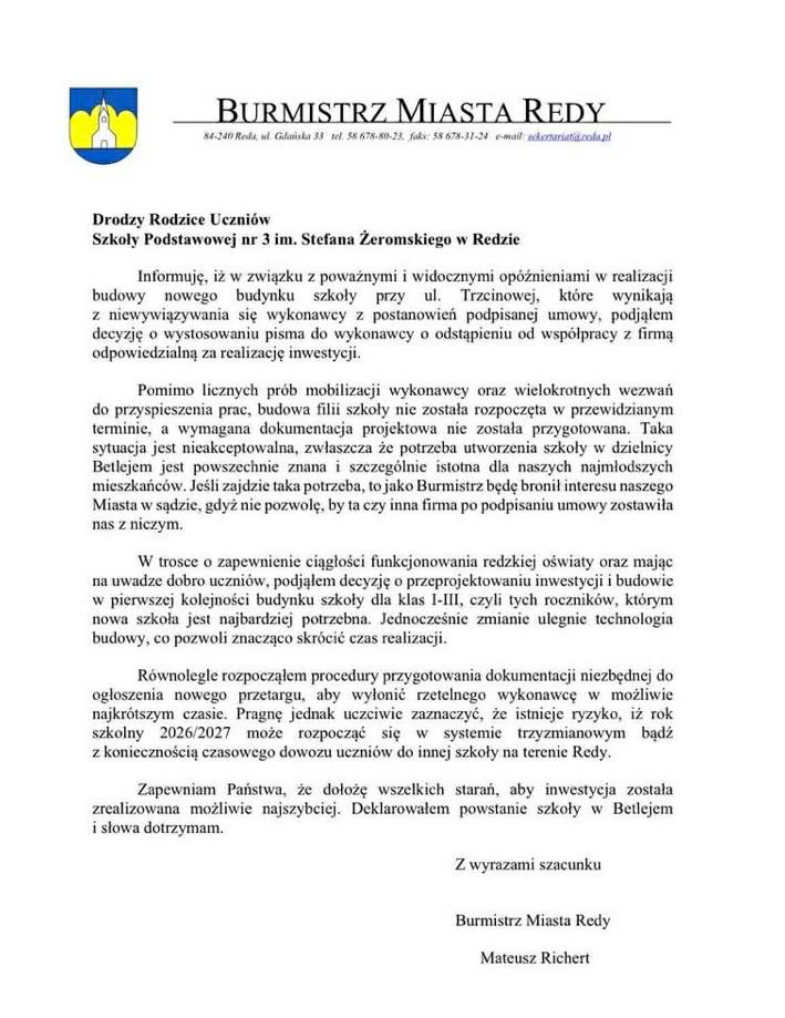 Równolegle rozpocząłem procedury przygotowania dokumentacji niezbędnej do ogłoszenia nowego przetargu, aby wyłonić rzetelnego wykonawcę w możliwie najkrótszym czasie. Pragnę jednak uczciwie zaznaczyć, że istnieje ryzyko, iż rok szkolny 2026/2027 może rozpocząć się w systemie trzyzmianowym bądź z koniecznością czasowego dowozu uczniów do innej szkoty na terenie Redy.