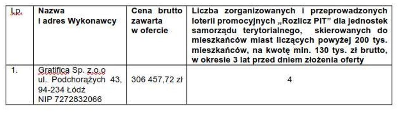 Dotyczy: postępowania prowadzonego w trybie podstawowym art. 275 pkt 1 ustawy Pzp, którego przedmiotem jest: "Kompleksowe zorganizowanie i przeprowadzenie Loterii promocyjnej pod nazwą ,Rozlicz PIT 2025 w Gdyni", skierowanej do podatników podatku dochodowego od osób fizycznych rozliczających dochody za rok 2025 na podstawie formularzy PIT w Urzędach Skarbowych na terenie Miasta Gdyni w okresie od 1 stycznia do 30 kwietnia 2026 roku"