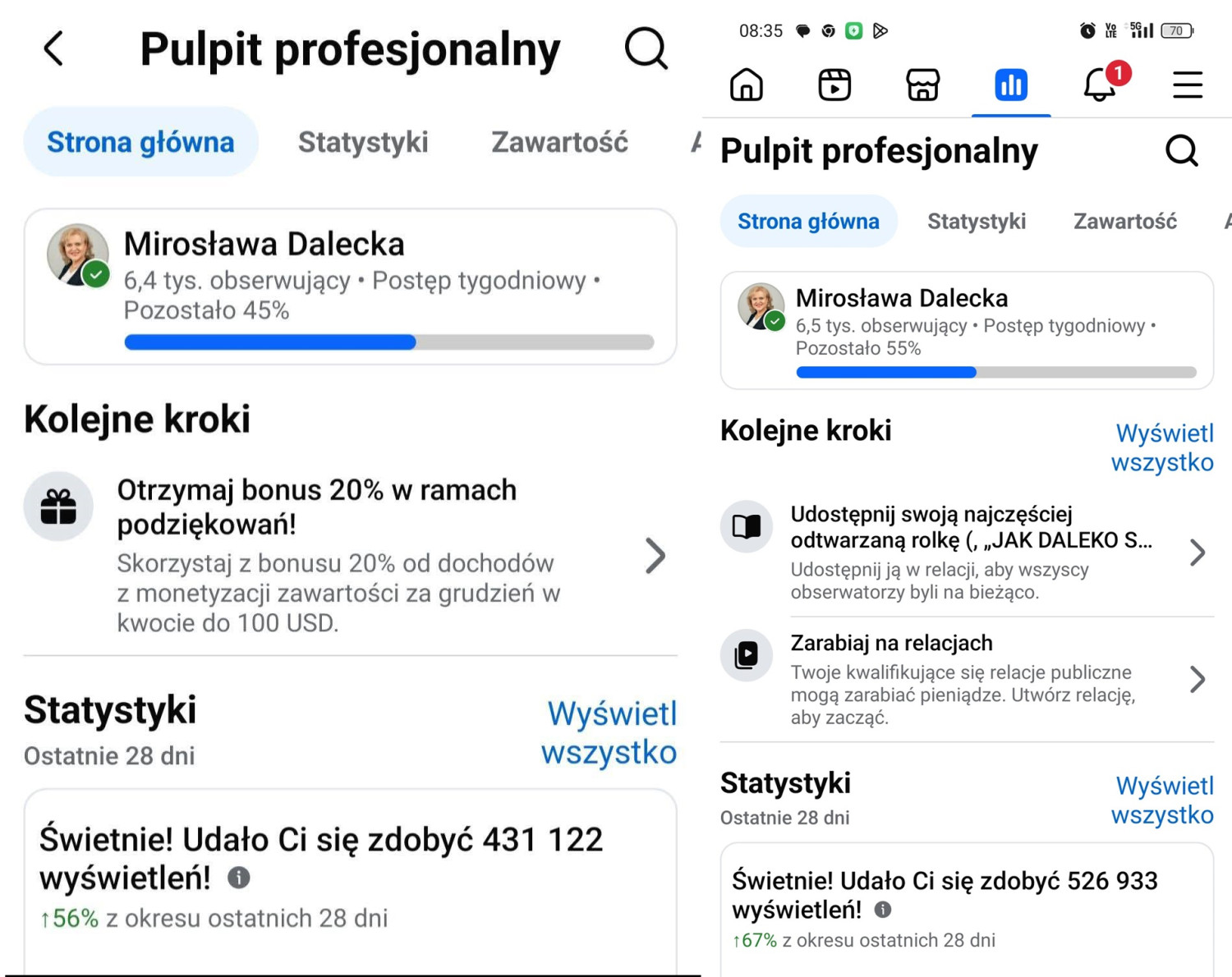 "Dzięki Wam udało mi się poprawić wynik wyświetleń moich postów w ciągu zaledwie jednego miesiąca z 431.122 do 526.933 wyświetleń, co daje ogromne zainteresowanie moją stroną na Facebooku i zwiększa moje wyświetlenia postów o 96 tysięcy w zaledwie w ciągu jednego miesiąca." - Mirosława Dalecka, radna powiatu chojnickiego napisała na swoim fejsbukowym profilu.