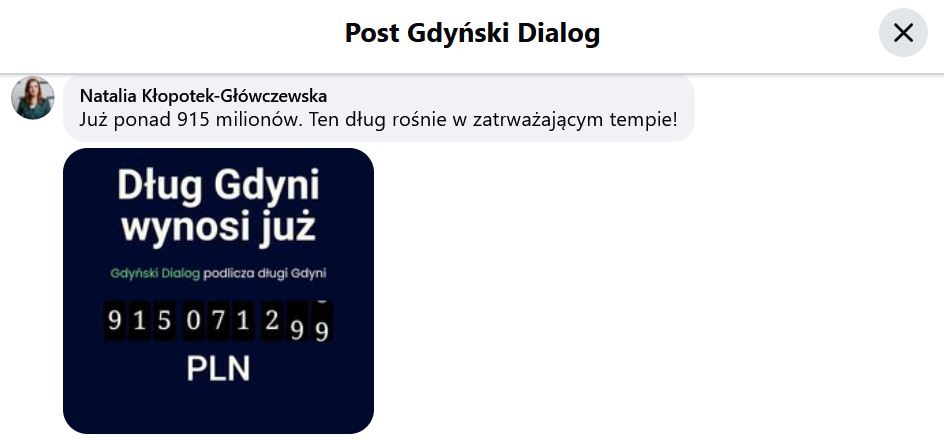 Pod postem zamieszczonym 24 stycznia 2023 swój komentarz zamieściła również obecna radna Gdyńskiego Dialogu Natalia Kłopotek-Główczewska, która wtedy napisała: „Już ponad 915 milionów. Ten dług rośnie w zatrważającym tempie!”