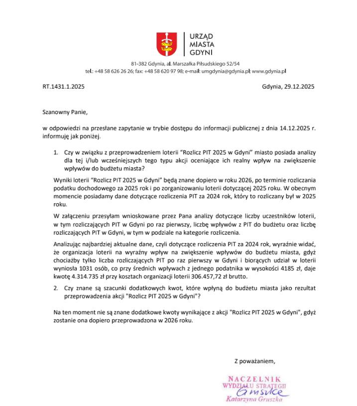Co więcej, należałoby zapytać — i na pewno zapytam — ilu podatników przestało płacić podatki w Gdyni i zestawić te dane z liczbami „loteryjnymi”. Ciekaw jestem, jaki wyszedłby bilans. A idąc dalej tą samą urzędową logiką, można by zestawić odpływ podatników z datą objęcia urzędu przez panią Kosiorek i ogłosić publicznie, że ten odpływ jest w 100% skutkiem działań pani prezydent.