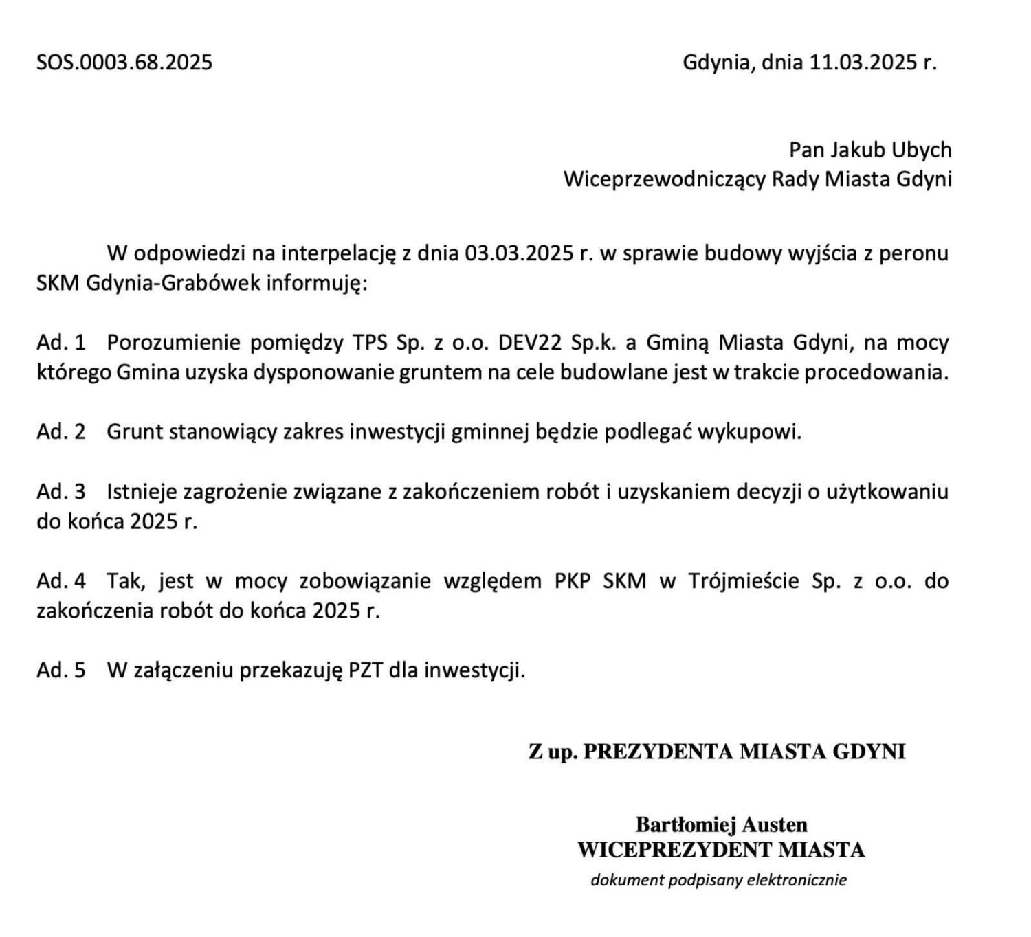 Jeśli finalnie dojdzie do problemów z rozliczeniem środków zewnętrznych, to warto jasno powiedzieć: nie będzie to „pech”, „zbieg okoliczności” ani „czynnik zewnętrzny”, tylko konsekwencja decyzji – albo ich braku – po stronie miasta." - Paweł Musiał opisał sprawę nadal nieistniejącego drugiego wejścia na peron przystanku osobowego SKM Gdynia Grabówek.