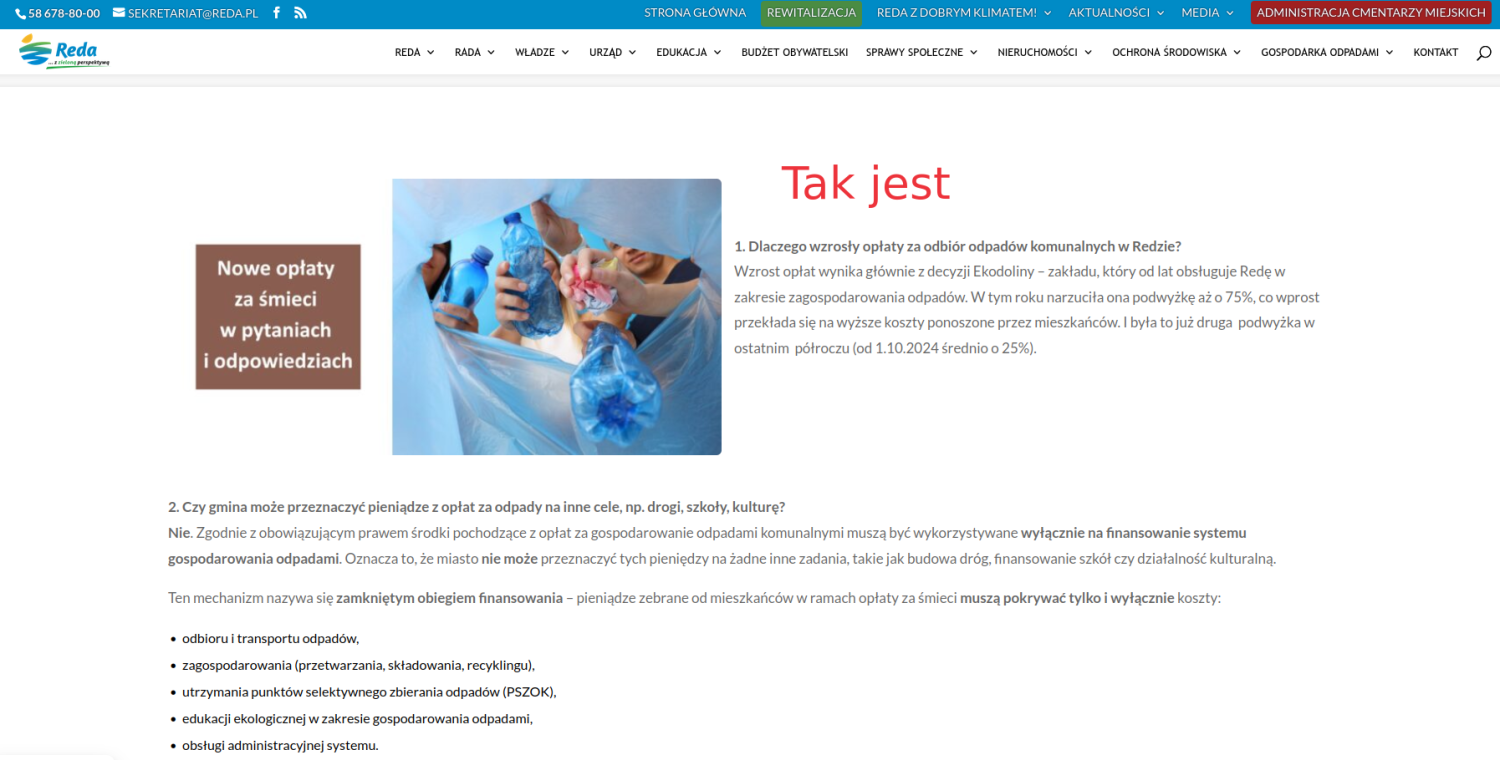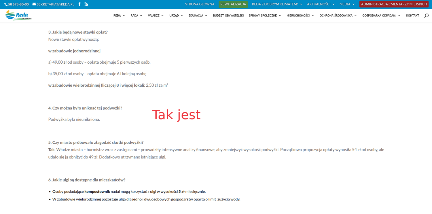 Miasto zmieniając treść na stronie przyznało się do zarzucanych działań. Tego konsekwencją jest również skarga Ruszczyka, którą Komisja Skarg, Wniosków i Petycji Rady Miejskiej w Redzie uznała za zasadną. I tak kolejny raz mamy do czynienia z bardzo nietransparentnym działaniem władz redy, które pozwoliły na to, by na oficjalnej stronie miasta pojawiły się nieprawdziwe informacje.