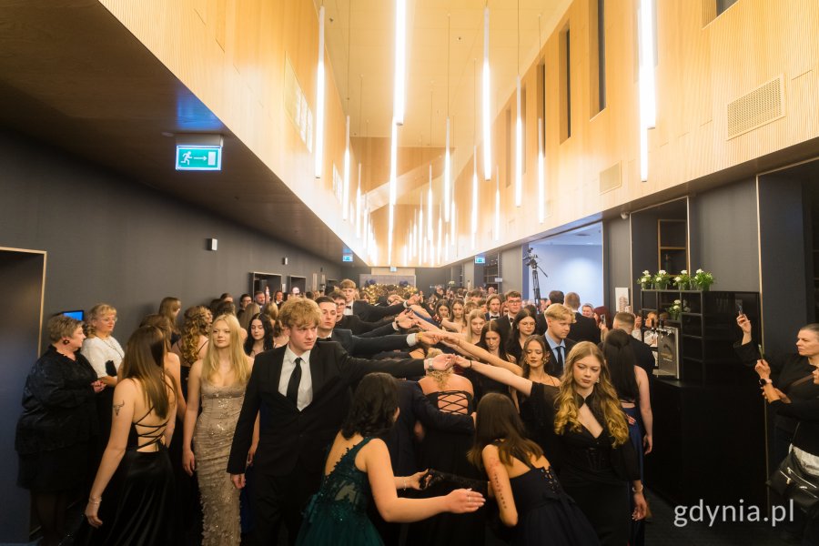 Maturzystki i maturzyści zatańczyli poloneza z prezydent Gdyni Aleksandrą Kosiorek i dyrektorką ZSAE Anną Marlewską (fot. Paweł Budziński)