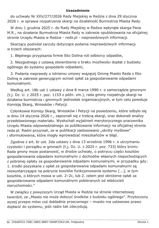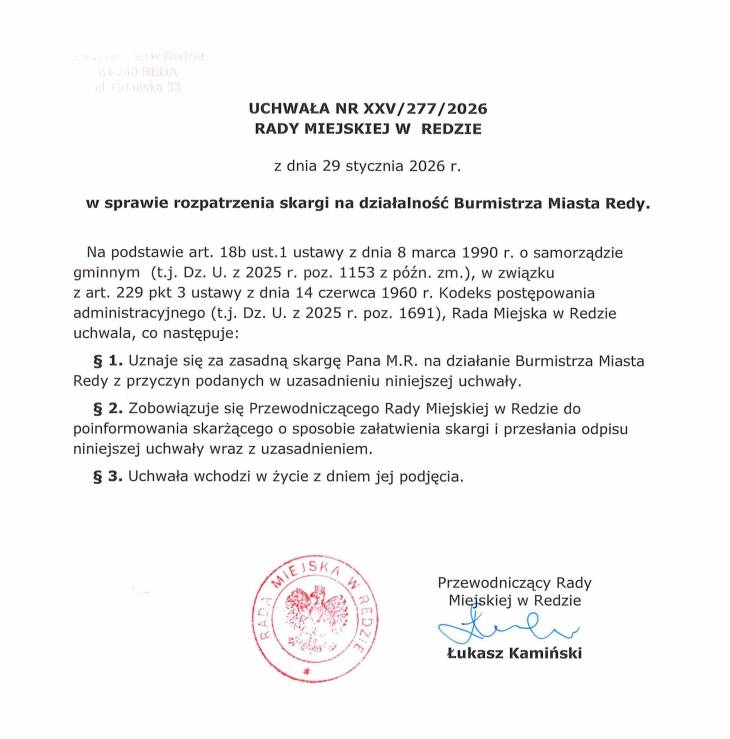 "Podczas XXV Sesji Rady Miejskiej w Redzie rozpatrując moją skargę na działalność burmistrza większość Radnych uchwaliła, że burmistrz odpowiada za okłamywanie Mieszkańców." - Marcin Ruszczyk podsumował decyzję radnych.