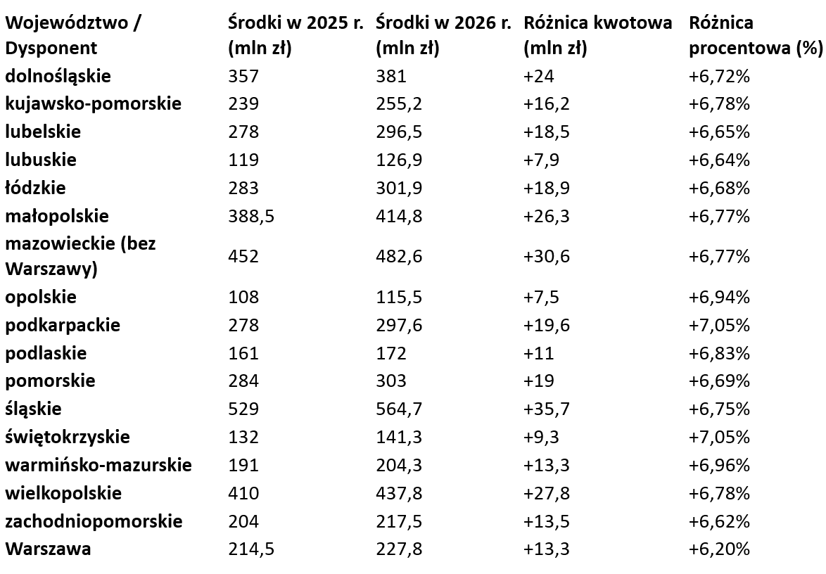 Jak wynika z informacji podanej przez MSWiA, kwota dofinansowania z Programu Ochrony Ludności i Obrony Cywilnej przekazana w tym roku województwom jest wyższa o około 311,4 mln zł w stosunku do środków z 2025 r. W sumie do samorządów trafi około 4,94 mld zł.