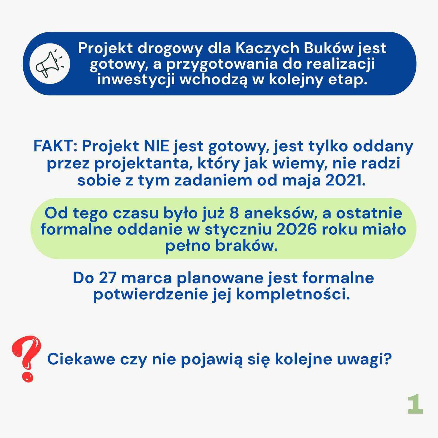 "Ostatnio w sprawie Kaczych Buków trochę zaczęło się dziać. Jak wiecie, 26.03.2026 o godz 17:00 organizujemy kolejne spotkanie z urzędnikami w sprawie o 3,5 roku opóźnionego układu drogowego na Kaczych Bukach. Chętnych zapraszamy! SP20 o 17:00." - poinformowała Monika Balcer ze Stowarzyszenia Nasze Kacze Buki.